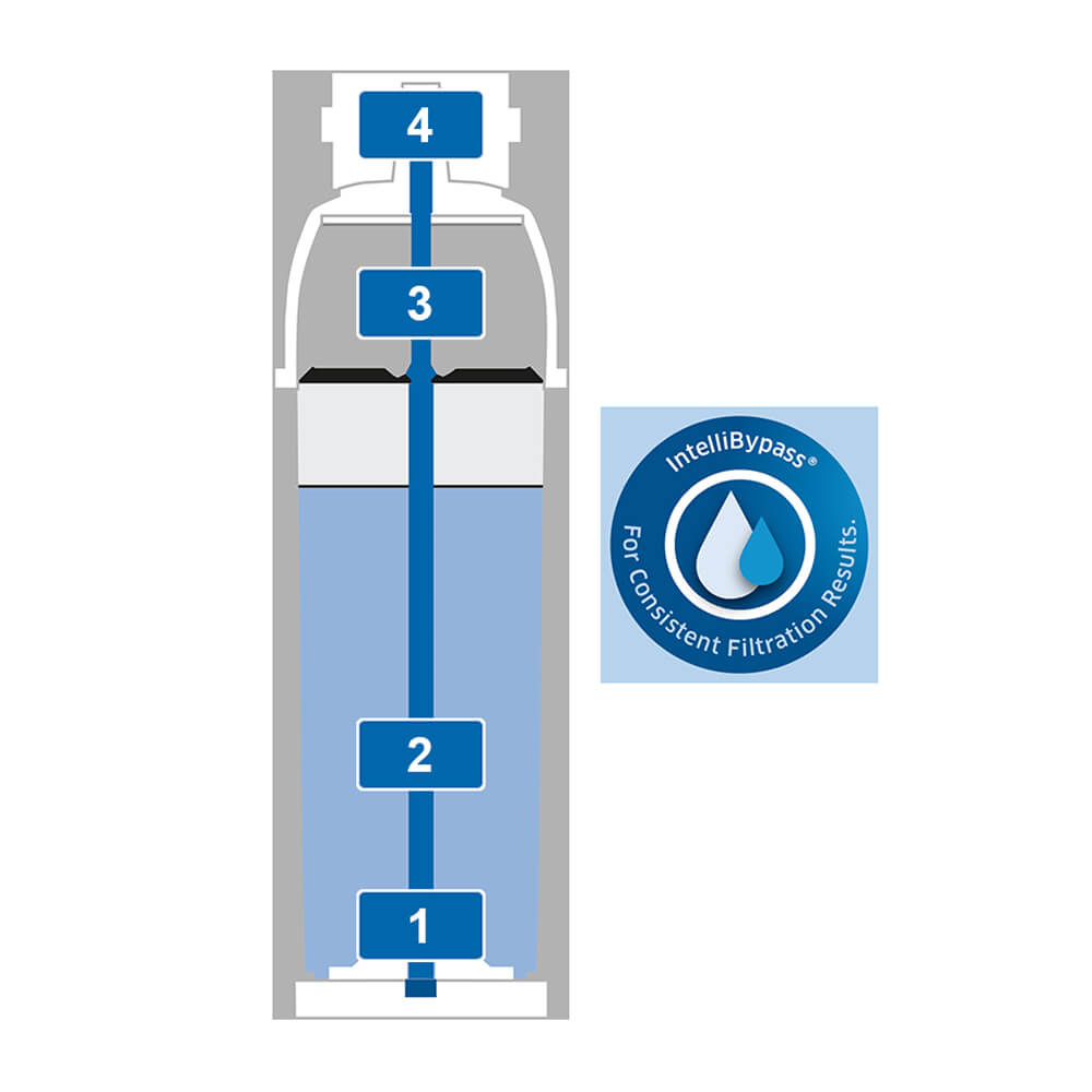 Zuletzt hält ein Vlies verbleibende feine Partikel zurück. Die einzigartige IntelliBypass Technologie steht für einen konstanten Verschnittwasser-Anteil, der unabhängig vom Volumenstrom ist. Dies sichert gleichbleibend hohe Wasserqualität, auch bei geringem Wasserdurchsatz.